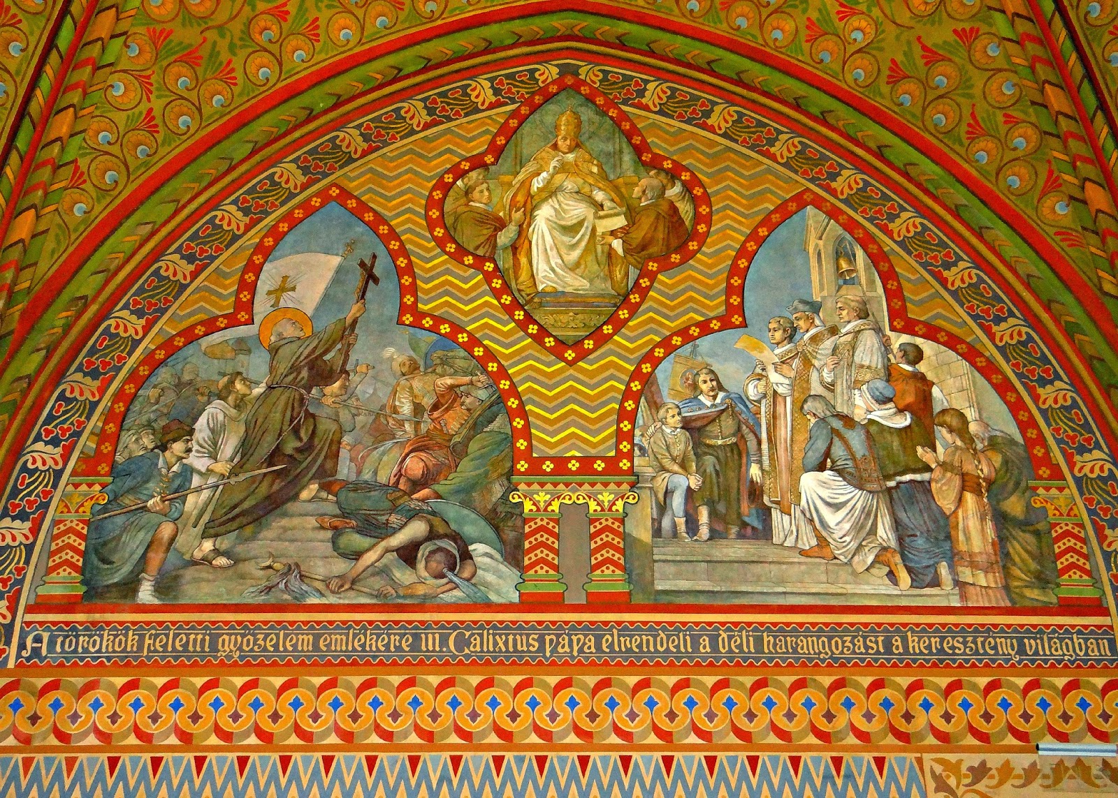 - A Mátyás-templombeli keresztelőkápolna freskójának, Lotz Károly művének témája III. Kallixtusz pápa és a déli harangozás elrendelése.[98]